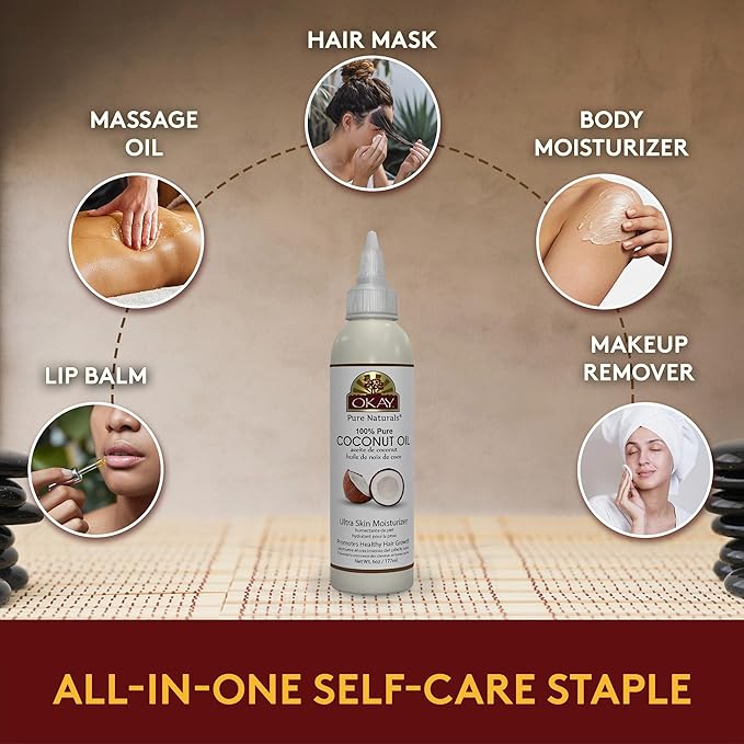 Okay 100% Pure Coconut Oil for Hair & Skin - Coconut Oil for Women & Men, Perfect for Body & Face, for Massage & Moisturizer, Natural - 6 Fl Oz Squeeze Bottle (Pack of 1)