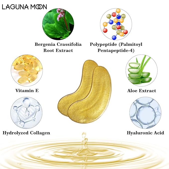- Effective Ingredients: Lagunamoon eye pads for puffy eyes and dark circles are formulated with famous and rising anti-aging star ingredients including Hydrolyzed Collagen, Hyaluronic Acid, Vitamin E, Polypeptide, Bergenia Crassifolia Root Extract and Aloe Extract, which is powerful but non-irritating, gentle on skin