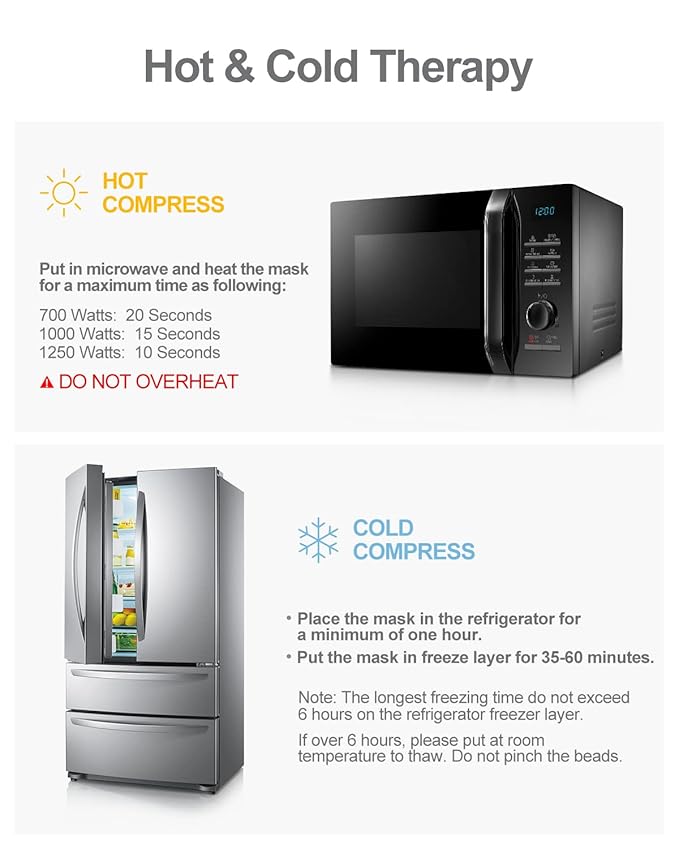 - ✔ HOT AND COLD THERAPY: Hot & cold therapy treatment can relaxes tired eyes, relief for fatigue & dark circles, and for puffy eyes/dry eyes/headaches/migraines. Use right before bed that good for sleeping, relaxation, and to wake up refreshed.