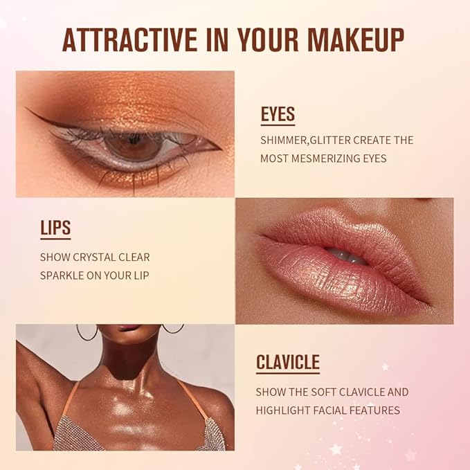 - Multi-use Versatility - Elevate your beauty routine by using our highlighter makeup not only on your cheekbones, brow bones, and nose bridge, but also as a shimmery eyeshadow or body shimmer.