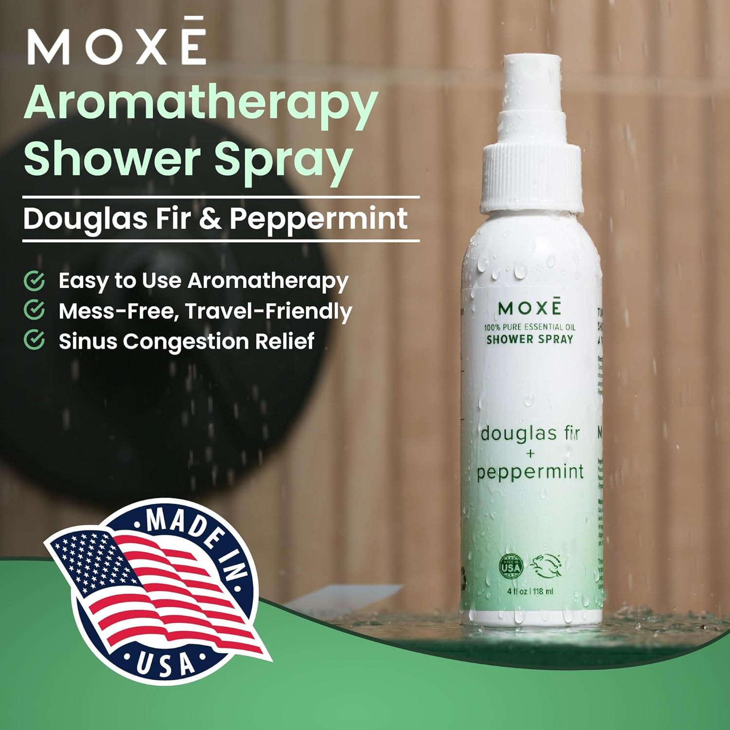 MOXE Aromatherapy Shower Spray - Douglas Fir & Peppermint, 100% Essential Oils, Made in USA, Aromatherapy, Sinus Congestion Relief, Respiratory Support, 4 Oz (1 Pack)