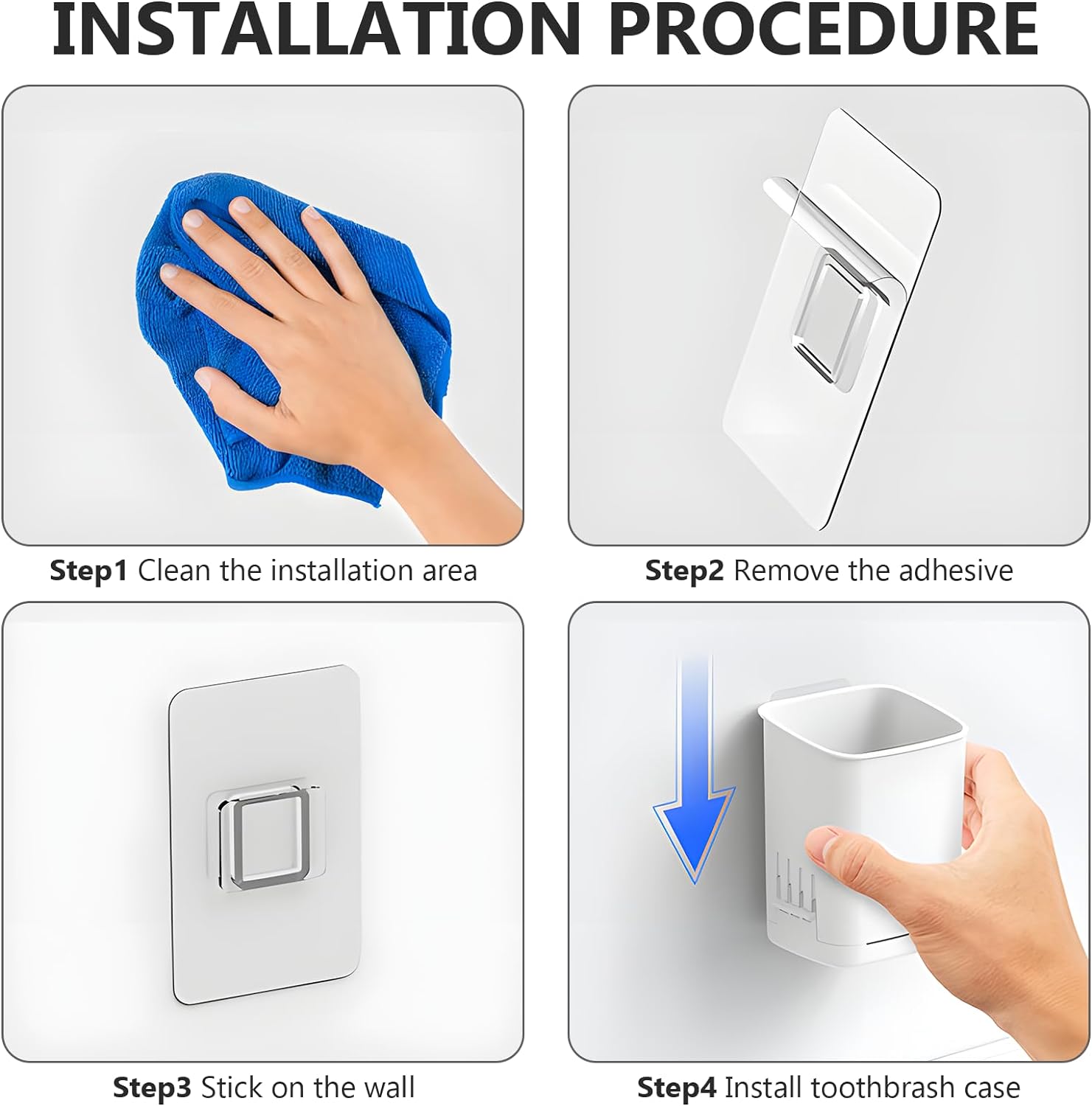 - 【Easy to Install】--No drills or holes are needed. Transparent adhesive leaves no damage to wall, please clean up the back side and the surface of the wall before use, tear off the protective film of the bracket and stick it directly on a smooth surface, If you want to use it in another location, you can tear it off and reuse it. The toothbrush holder wall mounted can be removed at any time for cleaning and hanging again.