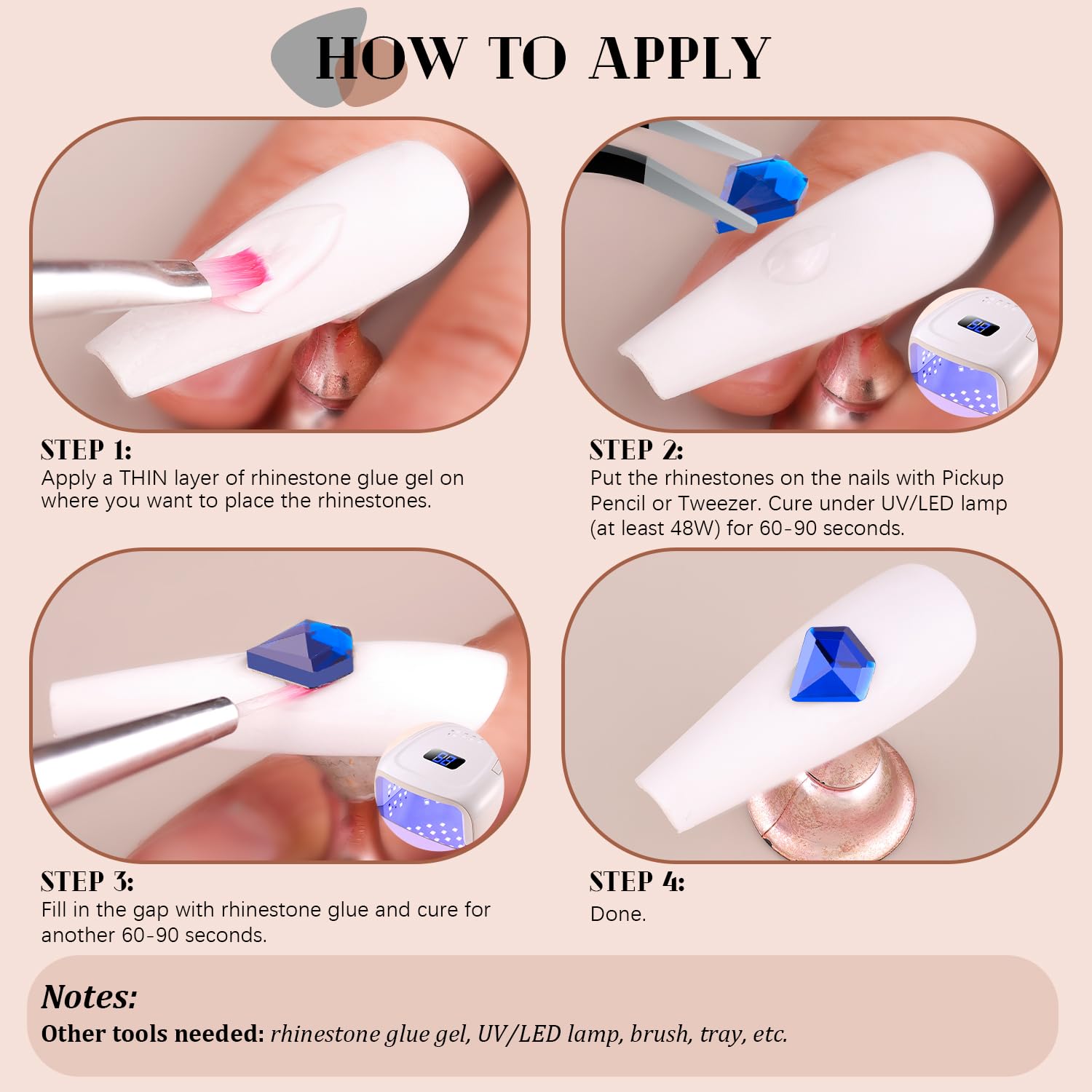 - đź’ŽEASY TO USE -- Easy to apply on artificial nails. After applying nail polish and applying enough gel on the nails, simply use the equipped tools (pickup pen + tweezers) to pick up the crystals onto your nails to create your fabulous DIY designs! These crystals gemstones are different from those hotfix stones, they are not self-adhesive, you have to apply glue to stick them (glue is not included.)