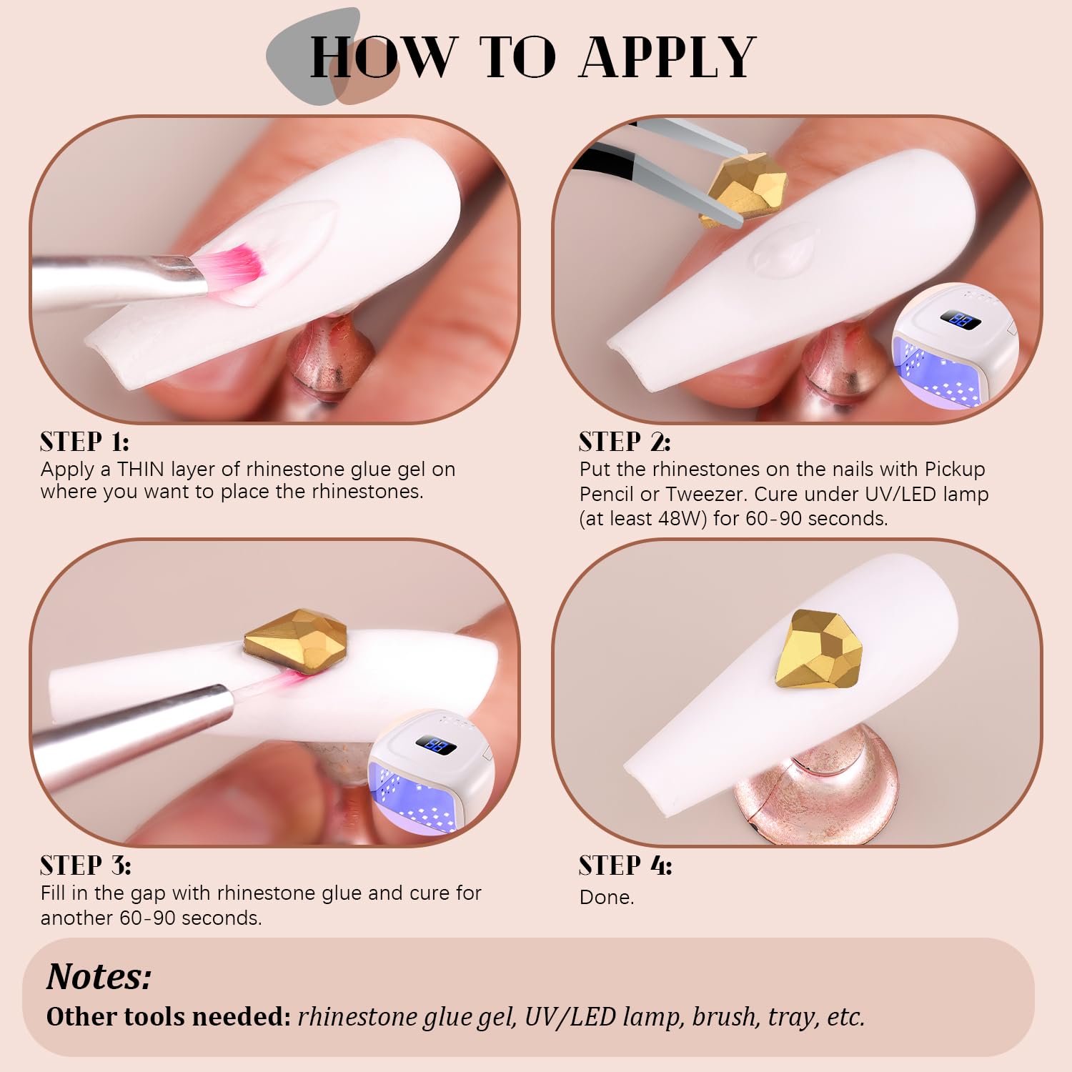 - đź’ŽEASY TO USE -- Easy to apply on artificial nails. After applying nail polish and applying enough gel on the nails, simply use the equipped tools (pickup pen + tweezers) to pick up the crystals onto your nails to create your fabulous DIY designs! These crystals gemstones are different from those hotfix stones, they are not self-adhesive, you have to apply glue to stick them (glue is not included.)