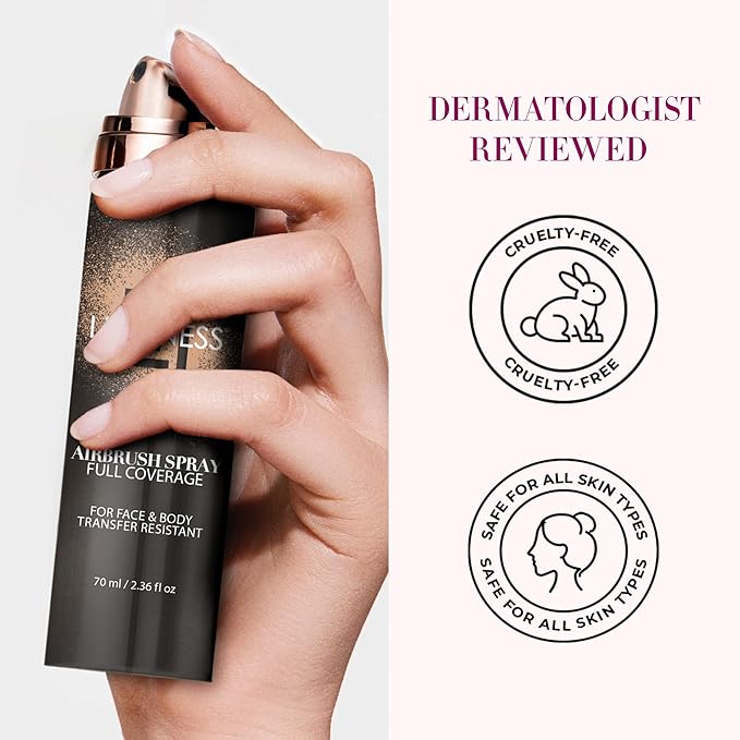 - Full Coverage Airbrush Finish: The LUMINESS Airbrush Spray Full Coverage Foundation delivers lightweight, buildable coverage for face and body, effortlessly concealing imperfections and providing a natural, airbrushed finish that lasts all day. 2.36 fl oz. Shade 050