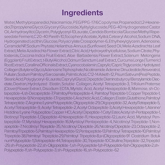 - [KEY INGREDIENTS] Formulated with 1,000ppm of 100% pure salmon PDRN to restore a natural glow and even skin tone by strengthening the skin barrier and supporting overall skin health. Powered by NAD+, an anti-aging ingredient that boosts cell turnover, stimulates collagen production, and supports repair, along with 50 peptides to visibly firm and plump the skin. *The formula’s soft violet hue comes from Vitamin B12, while its natural pearlescence is derived from ceramides.